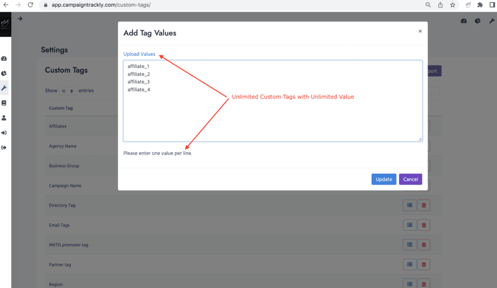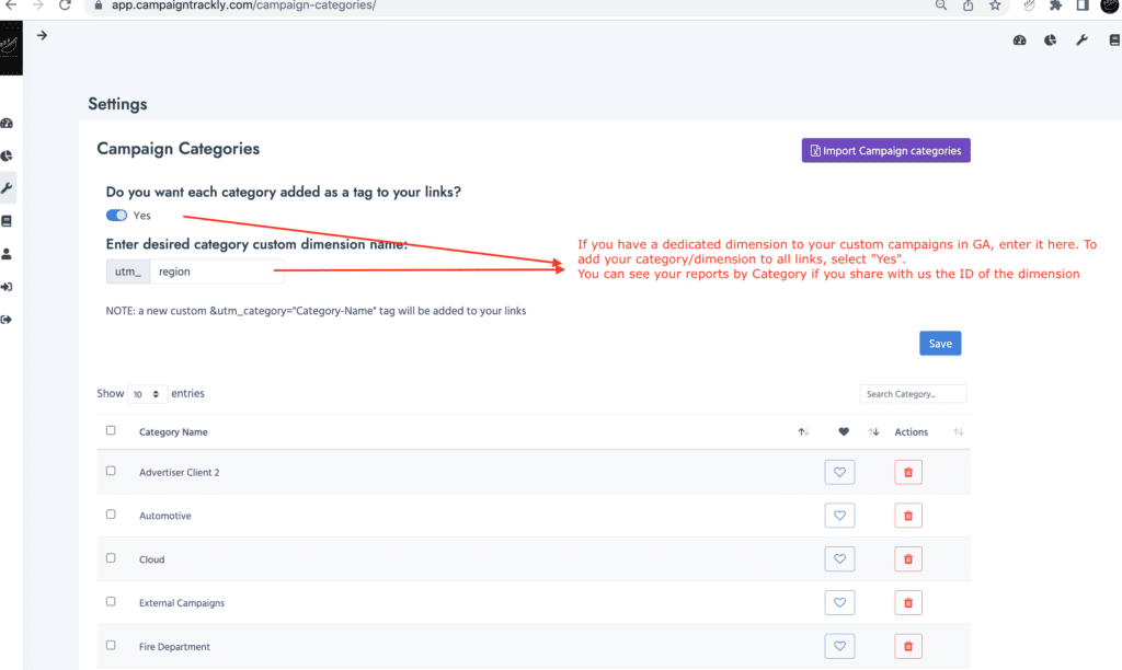 Just go to Campaign Categories, type your categories, set up the custom dimension name, select “yes” to make sure the category is added to your link each time, and then start tagging. You can see stats by category on our platform if you tell us the GA ID if the custom dimension!